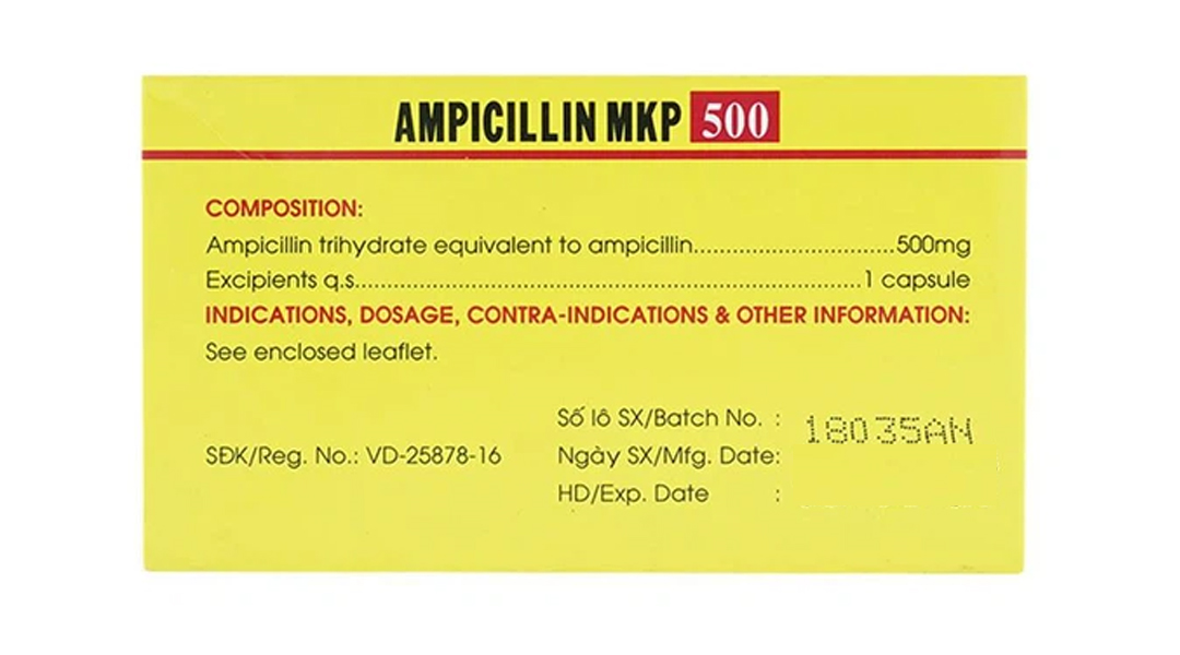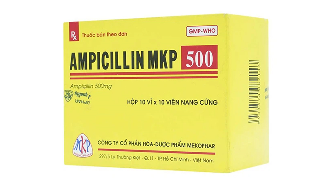 Rx – Thuốc bán theo đơnAMPICILLINTên sản phẩm: AMPICILLIN MKP 500Thành phần:Ampicillin trihydrate tuong duong ampicillin….500mgTá dược vừa đủ 1 viên[Công dụng:Đối tượng sử dụng:Liều dùng:]Xem thêm tờ hướng dẫn sử dụngQuy Cách đóng gói: Hộp 10 vỉ x 10 viên nénThương hiệu:Nơi sản xuất: VIỆT NAMTên Nhà sản xuất: MEKOPHAR 297/5 Ly Thuong Kiet St. – W.15 – Dist 11 – HCMC – VietnamGiấy tiếp nhận đăng ký bản công bố sản phẩm: VD-25878-16