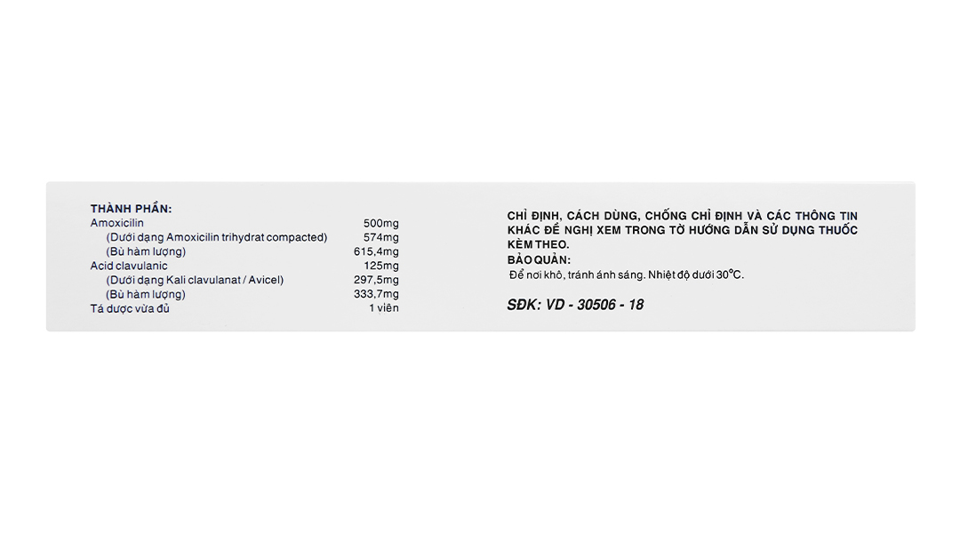 Hoạt chất: Amoxicilin 500 mg (dưới dạng Amoxicilin trihydrat compacted 574 mg) bù hàm lượng 615,4 mg, Acid clavulanic 125 mg (dưới dạng Kali clavulanat/Avicel 297,5 mg) bù hàm lượng 333,7 mg.