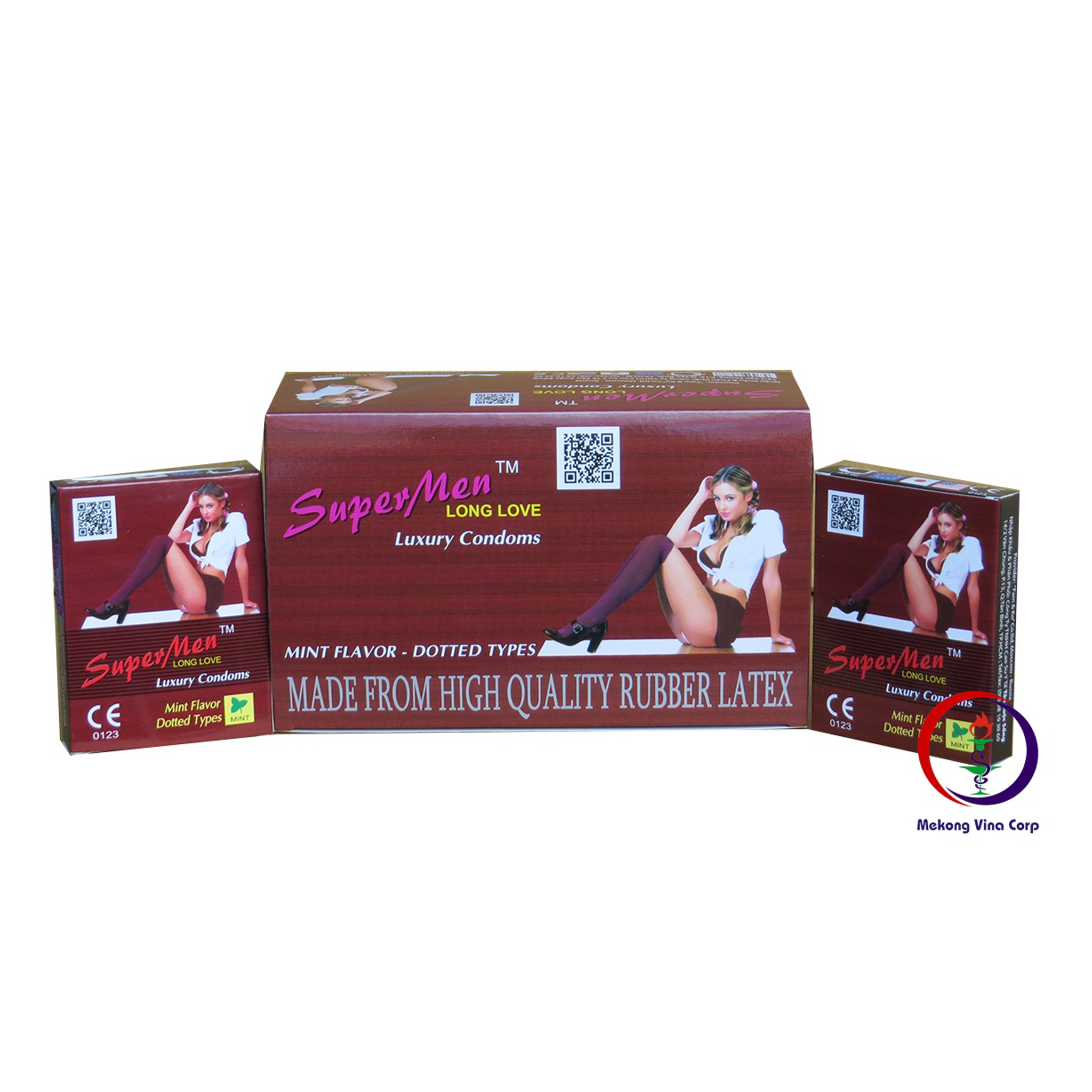 Bao cao su Super men là loại bao cao su có nhiều gai nổi dọc suốt chiều dài trên thân bao giúp kích thích mạnh bạn gai để nhanh đạt được cực khoái khi quan hệ. Bao cao su Super men cũng có hương bạc hà bên trong đồng thời có chất kéo dài thời gian cho nam giới, giúp nam giới tự tin hơn khi quan hệ với bạn tình.