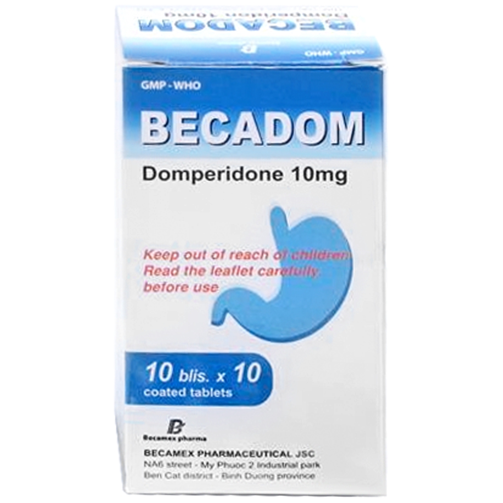 Rx Thuốc kê đơnBECADOMHộp 10 vỉ x 10 viên nén bao phimThành phần:Mỗi viên nén bao phim chứa: Domperidon maleat 12,73 mg (tương đương với 10 mg domperidon base)Tá dược v.đ.Chỉ định: Điều trị các triệu chứng nôn và buồn nôn.Chống chỉ định, liều lượng – cách dùng & các thông tin khác: Xem tờ hướng dẫn sử dụng.Bảo quản:Nơi khô, tránh ánh sáng, nhiệt độ dưới 30°C.