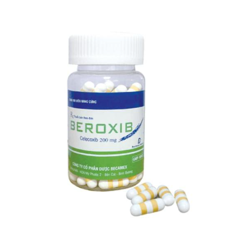 Rx Thuốc theo toaBEROXIB Celecoxib 200 mgChai 100 Viên nang cứngTHÀNH PHẦN:Mỗi viên nang cứng chứa:Celecoxib 200 mgTá dược v.đ. BẢO QUẢN:Nơi khô, nhiệt độ dưới 30°C, tránh ánh sáng.CHỈ ĐỊNH, CHỐNG CHỈ ĐỊNH, LIỀU LƯỢNG – CÁCH DÙNG – CÁC THÔNG TIN KHÁC: Xem tờ hướng dẫn sử dụng. CÔNG TY CP DƯỢC ENLIEĐường NA6 – KCN Mỹ Phước 2 – P.Mỹ Phước – Tx.Bến Cát – T.Bình Dương.SĐK / Reg. No.: VD-29621-18TIÊU CHUẨN: TCCS -Số LÔ:030621NSX:29/07/21HSD: 29/07/248 119 36 199 1490181