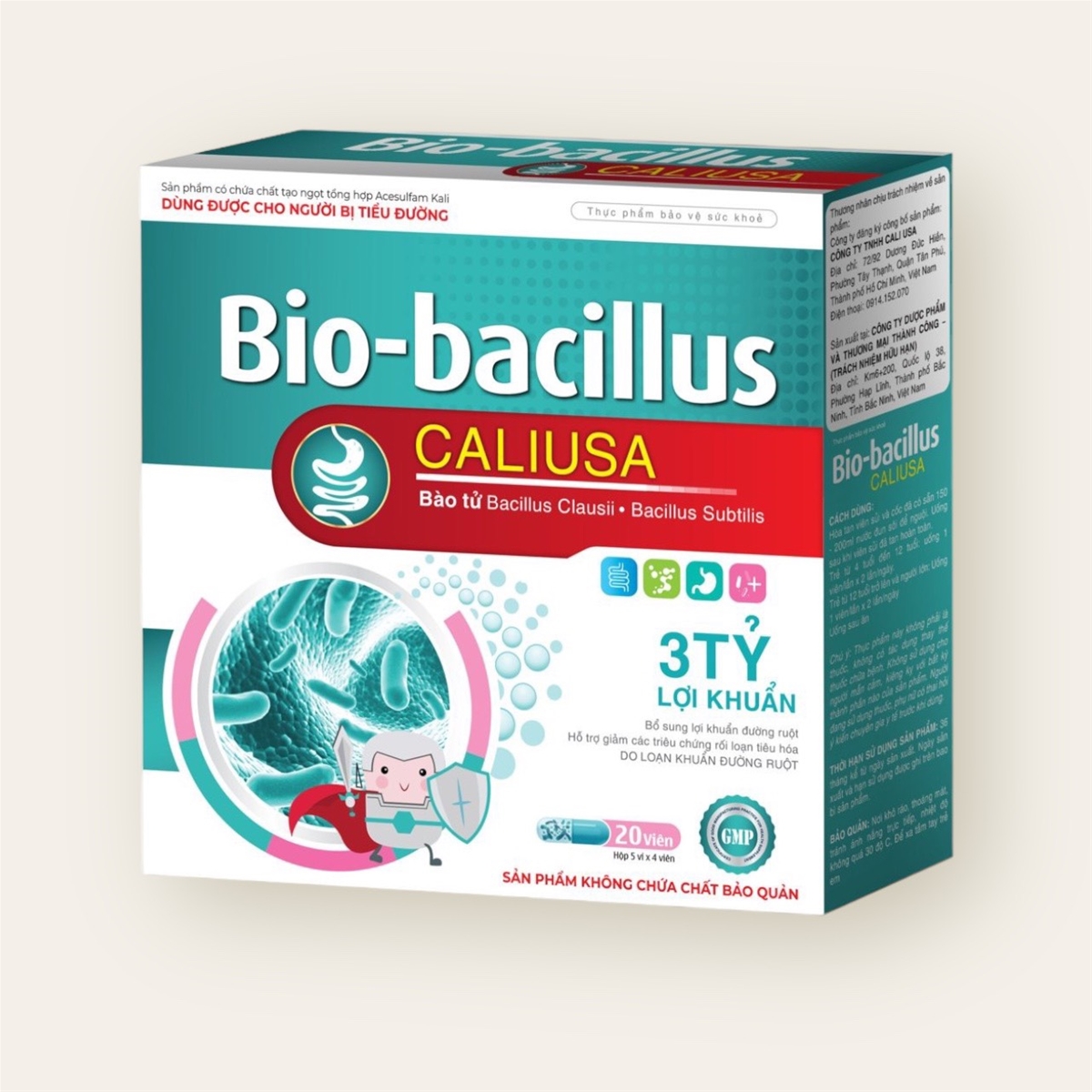 Trong 1 viên sủi 4g có chứa: Bacillus clausi:…………….. 1,5 x 109 CFU Bacillus subtilis:…………… 1,5 x 109 CFU Kẽm gluconate:……………..10mg ( tương đương 1,42mg Kẽm) Vitamin B1: ……………………1mg ( Thiamin mononitrat) Phụ liệu: Chất điều chỉnh độ acid ( Natri carbonat, acid citric ), chất độn ( isomalt ), Lactose, chất ổn định ( polyvinyl pyrrolidone ), chất làm dày ( polyethyene glycol ), chất tạo màu tổng hợp ( sunset yellow FCF ), chất tạo ngọt tổng hợp ( acesulfam kali ), hương liệu tổng hợp ( Hương Cam ), cồn thực phẩm, nước tinh khiết.