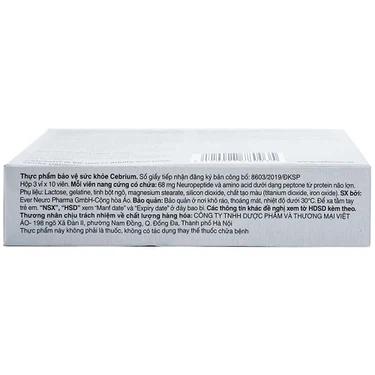 Cebrium nhập khẩu từ Áo, sản xuất trên công nghệ hiện đại giúp cải thiện chức năng nhận thức và trí nhớ sau đột quỵ và sau các tổn thương thần kinh. Bên cạnh đó còn hỗ trợ cải thiện trí nhớ cho người cao tuổi, tăng khả năng tập trung, tăng khả năng chịu đựng về trí não do Stress.