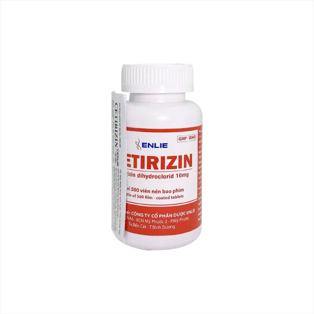 Rx Thuốc bán theo toaCETIRIZINCetirizin Dihydroclorid 10mgChai 500 viên nén bao phimSản xuất tại: CÔNG TY CỔ PHẦN DƯỢC ENLIEĐường NA6 – KCN Mỹ Phước 2 – P.Mỹ Phước – Tx.Bến Cát – T.Bình DươngTHÀNH PHẦN:Mỗi viên nén bao phim chứa:Cetirizin. 2HCL…………10mgTá dược v.đ.Chỉ định, chống chỉ định, liều lượng – cách dùng & các thông tin khác: Xem tờ hướng dẫn sử dụng.Không dùng thuốc khi lái xe và vận hành máy móc.Để xa tầm tay trẻ em.Đọc kỹ hướng dẫn sử dụng trước khi dùng.Bảo quản: Nơi khô, tránh ánh sáng, nhiệt độ dưới 30°C.