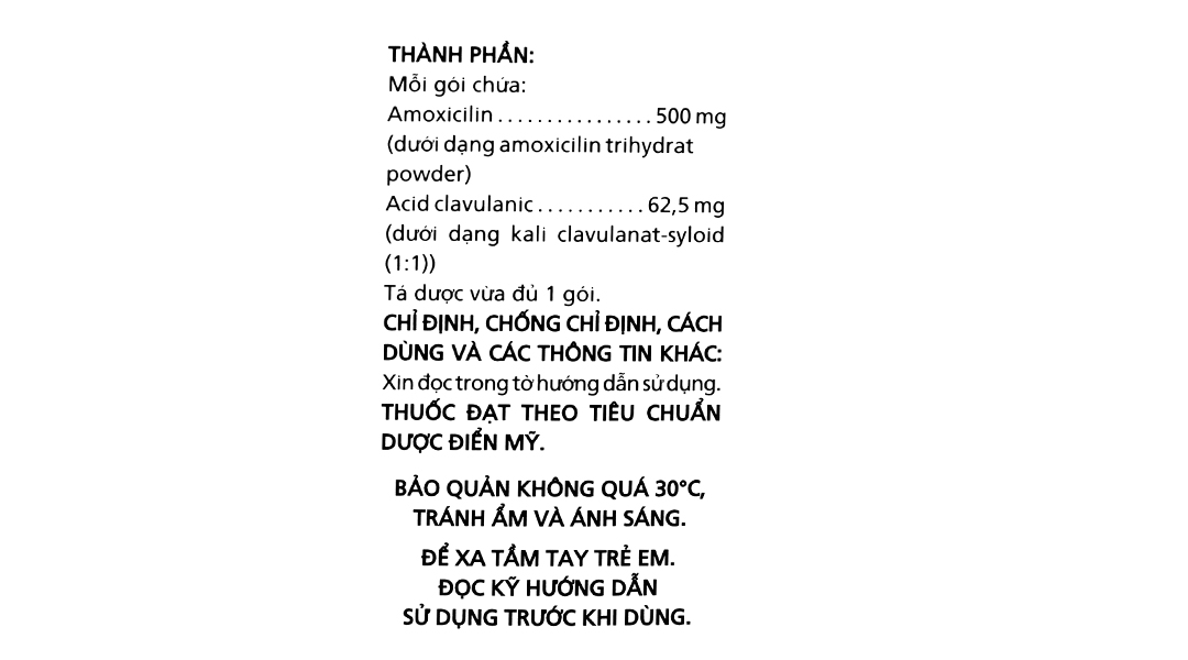 Dược chất: Amoxicilin (dưới dạng amoxicilin trihydrat powder) 500 mg, Acid clavulanic (dưới dạng kali clavulanat – syloid (1:1)) 62,5 mg.
