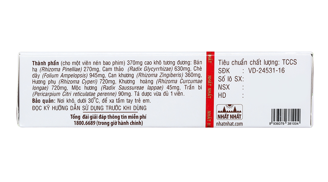 Bán hạ (Rhizoma Pinelliae) 270mg, Cam thảo (Radix Glycyrrhizae) 630mg, Chè dây (Folium Ampelopsis) 945mg, Can khương (Rhizoma Zingiberis) 360mg, Hương phụ (Rhizoma Cyperi) 720mg; Khương hoàng (Rhizoma Curcumae longae) 720mg, Mộc hương (Radix Saussure-ae lappae) 45mg, Trần bì (Percicarpium Citri reticulatae perenne) 90mg.