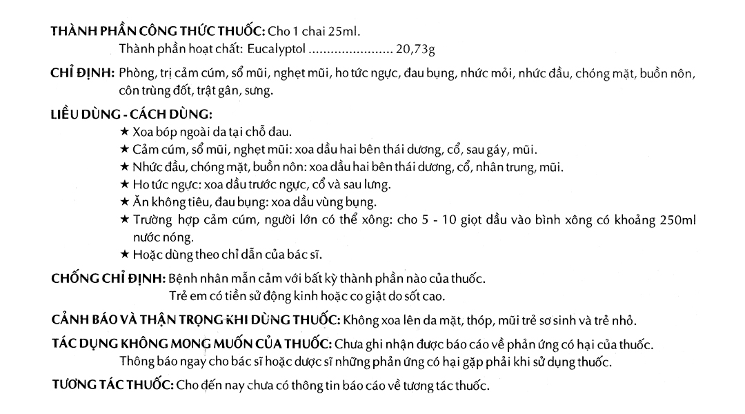 Dùng trong cảm, sổ mũi, ho, đau bụng, mỏi cơ, đau đầu, buồn nôn, côn trùng đốt, trật gân.