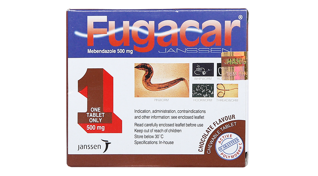 FUGACAR (chewable tablet, chocolate) được chỉ định điều trị nhiễm một hay nhiều loại giun đường ruột: