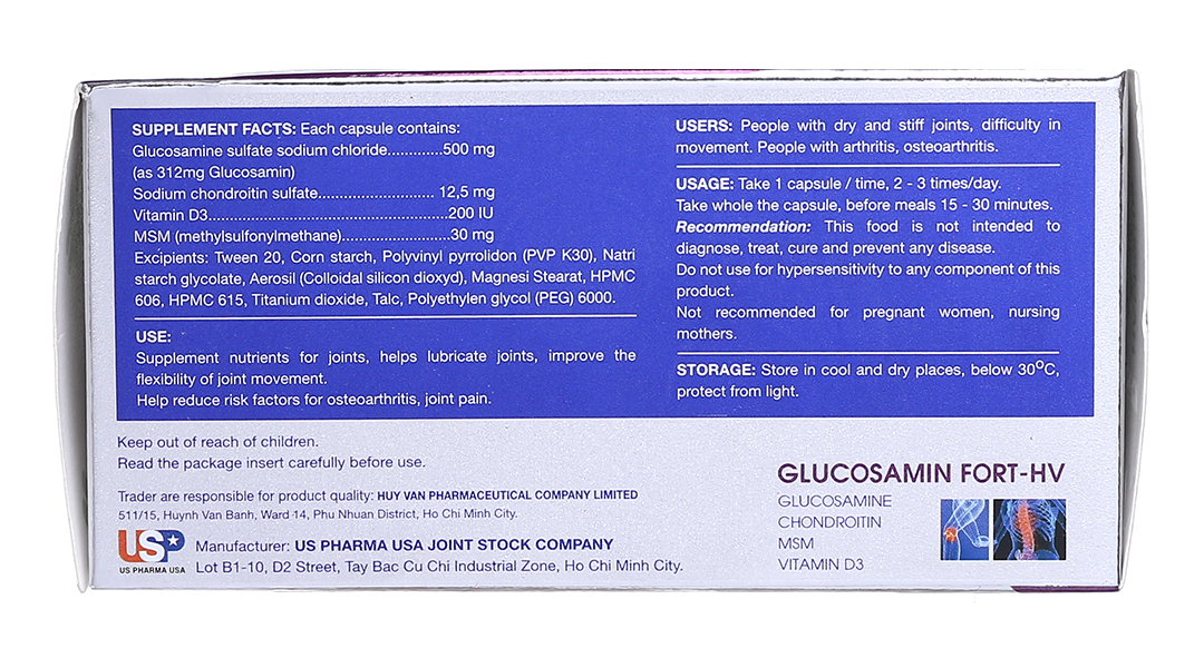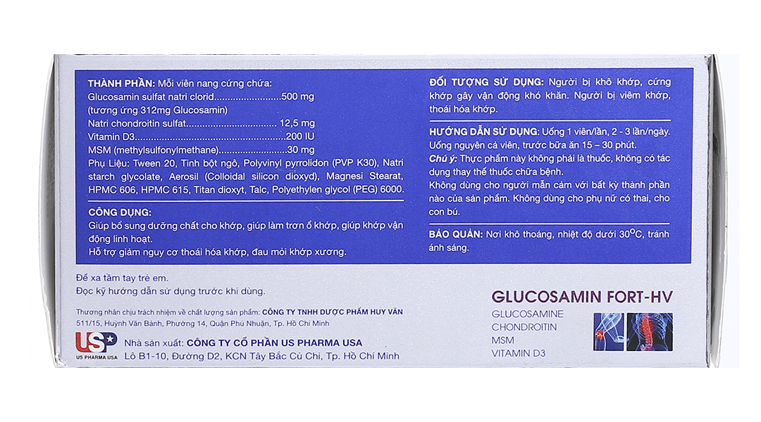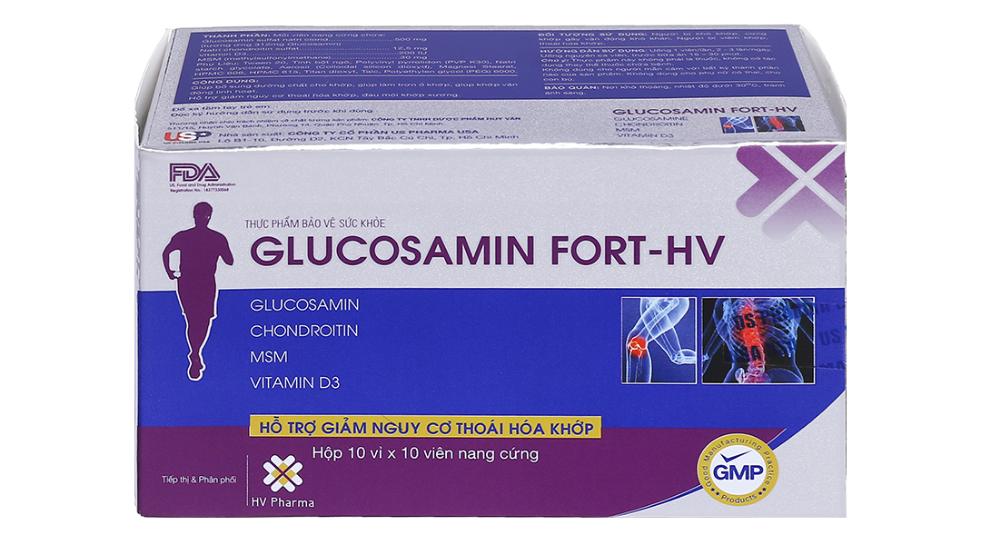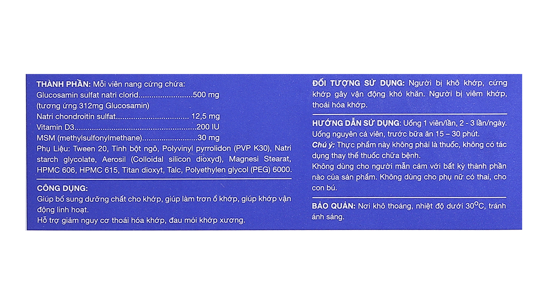 Glucosamin sulfat natri clorid (tương ứng 312mg Glucosamin): 500 mg, Natri chondroitin sulfat: 12,5 mg, Vitamin D3: 200 IU, MSM (methylsultonylmethane): 30 mg