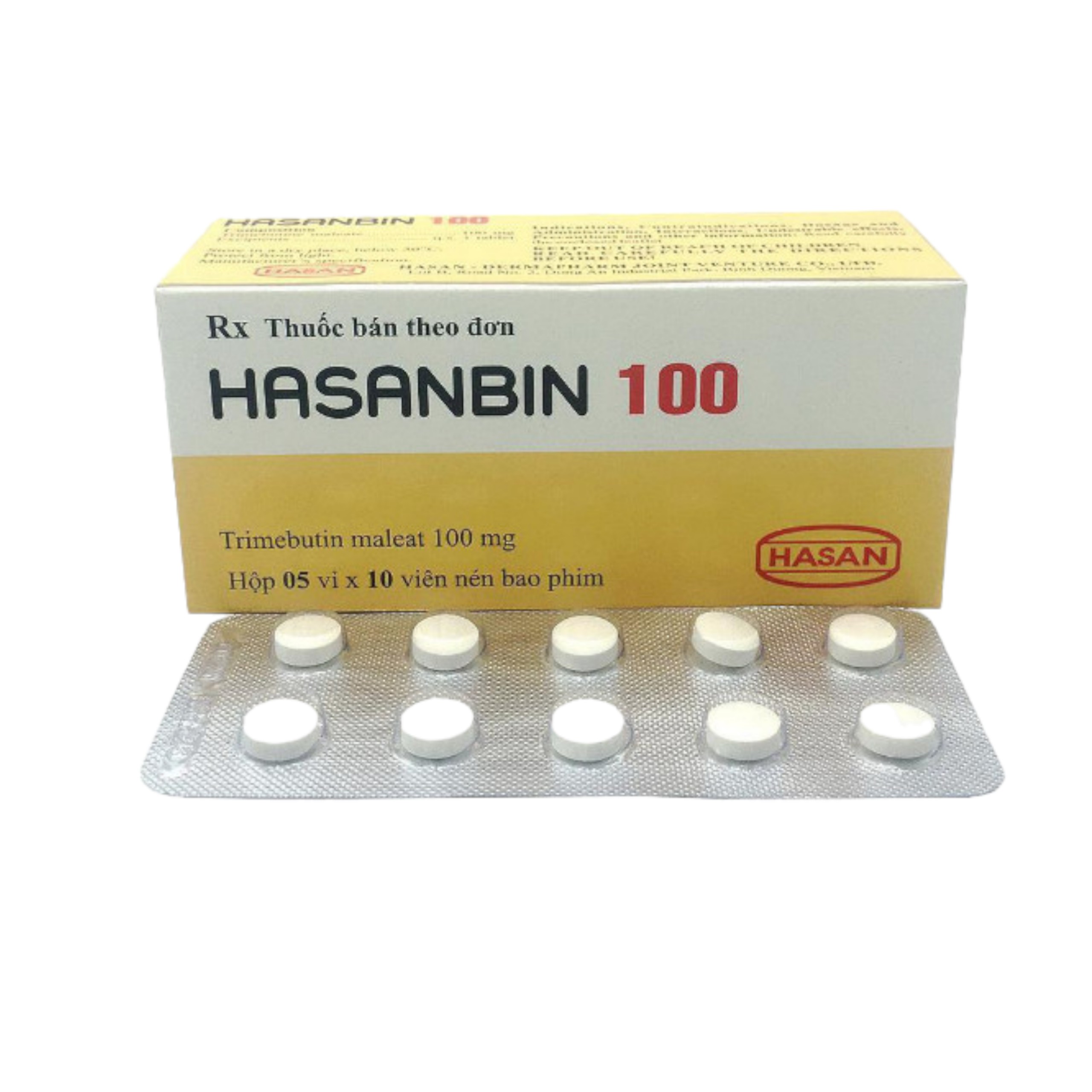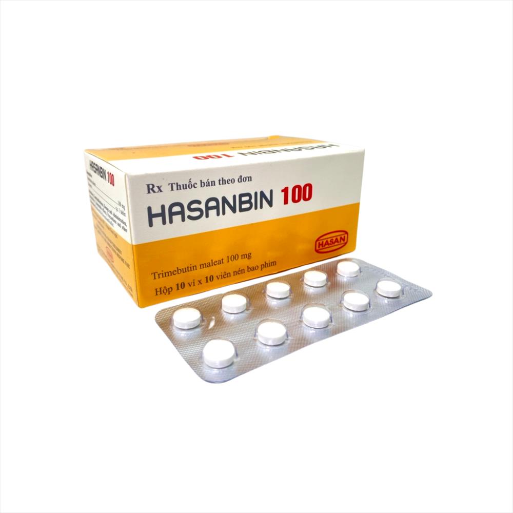 Thuốc Hasanbin 100 là thuốc thuộc danh mục thuốc điều hòa tiêu hóa, chống đầy hơi & kháng viêm. Thuốc được chỉ định trong điều trị triệu chứng đau có liên quan đến rối loạn chức năng đường tiêu hóa và ống mật, rối loạn nhu động ruột, điều trị đau và khó chịu đường ruột do rối loạn chức năng đường ruột. Với thành phần chính là dược chất trimebutin maleat giúp nhanh các triệu chứng trên. Thuốc Hasanbin 100 được sản xuất bởi Công ty trách nhiệm hữu hạn Liên doanh Hasan Dermapharm. Thành phần: