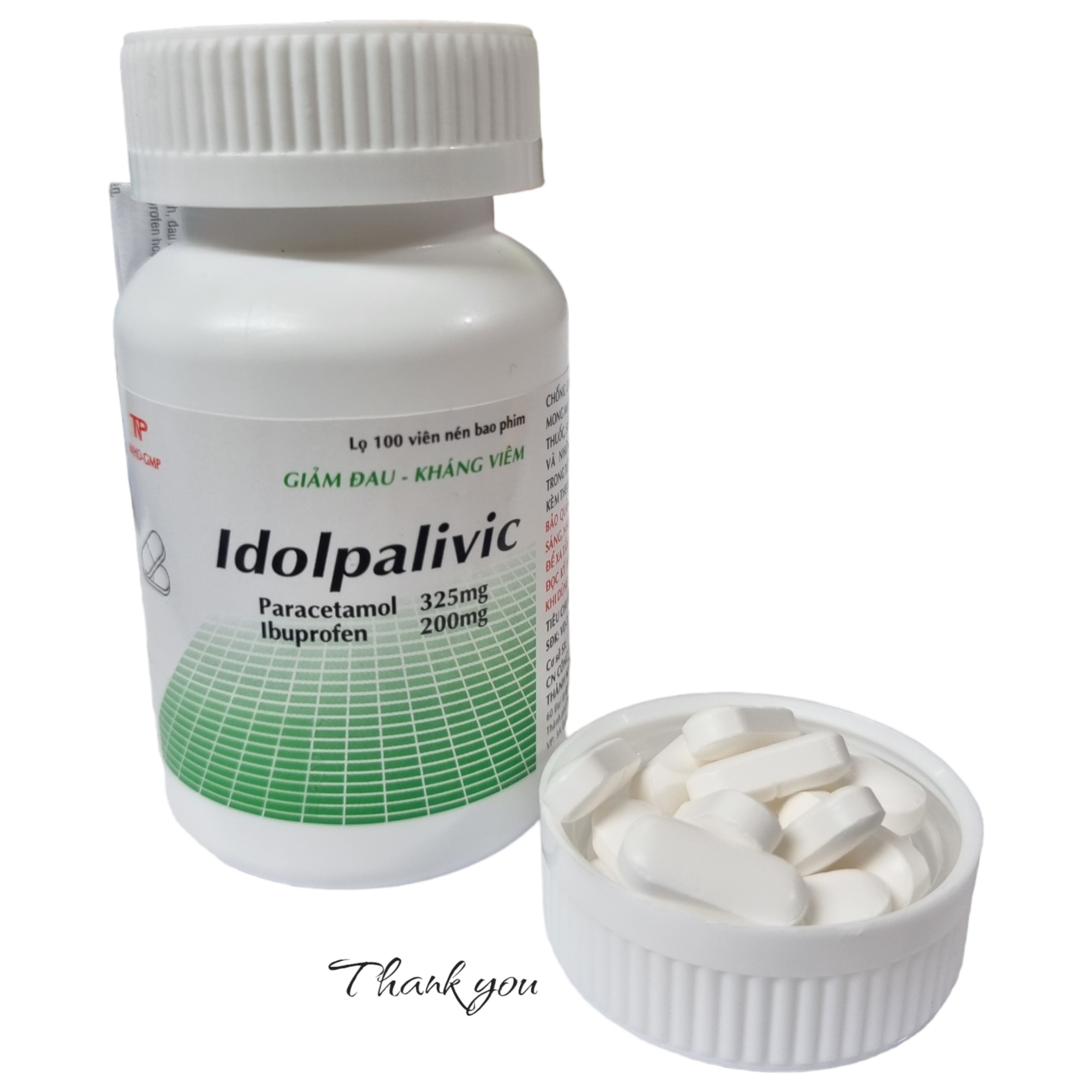 Thành phần Mỗi viên nén bao phin chứa: Paracetamol 325mg Ibuprofen 200mg Mô tả: Chỉ định sử dụng thuốc Idolpalivic Thuốc Idolpalivic được chỉ định sử dụng trong những trường hợp: Giảm đau nhức tại cơ và xương từ nhẹ đến trung bình Đau răng Đau vùng thắt lưng Viêm khớp Viêm bao hoạt dịch Đau cơ Thấp khớp Bong gân Đau trong chấn thương như gãy xương, trật khớp Đau sau phẫu thuật Đau bụng kinh Hạ sốt Bên cạnh những công dụng trên, thuốc Idolpalivic có thể còn được sử dụng điều trị một số bệnh lý khác mà không được liệt kê ở trên. Do đó, trước khi dùng thuốc hãy tham khảo ý kiến của bác sĩ để được tư vấn cũng như sử dụng thuốc sao cho hiệu quả. Cách dùng và liều lượng sử dụng thuốc Idolpalivic Thuốc Idolpalivic được bào chế dưới dạng viên nén, do vậy có thể sử dụng thuốc lúc đói hoặc no. Người bệnh nên uống thuốc cùng với một ly nước đầy để tránh tình trạng kích thích dạ dày. Liều lượng sử dụng thuốc Idolpalivic sẽ phụ thuộc vào tình trạng bệnh và độ tuổi của bệnh nhân. Đối với người lớn dùng 1-2 viên/lần, ngày 3 lần. Trong trường hợp đau mãn tính chỉ dùng liều 1 viên/lần, ngày 3 lần. Tác dụng phụ Một số tác dụng không mong muốn có thể xảy ra khi sử dụng thuốc Idolpalivic bao gồm: Mẩn ngứa Nổi ban Sốt Mệt mỏi Chướng bụng Buồn nôn, nôn Nhức đầu Hoa mắt Chóng mặt Phản ứng dị ứng như viêm mũi, nổi mày đay Đau bụng Chảy máu dạ dày, ruột Loét dạ dày tiến triển Mất ngủ Ù tai Rối loạn thị giác Giảm thính lực Thời gian chảy máu kesod ài Độc tính trên thận khi lạm dụng lâu ngày Giảm bạch cầu trung tính Giảm toàn thể huyết cầu Thiếu máu Hội chứng steven-johnson Trầm cảm Rụng tóc Viêm màng não vô khuẩn Nhìn mờ Rối loạn nhìn màu Giảm thị lực do ngộ độc thuốc Rối loạn co bóp túi mật Nhiễm độc gan Viêm bàng quang Tiểu ra máu