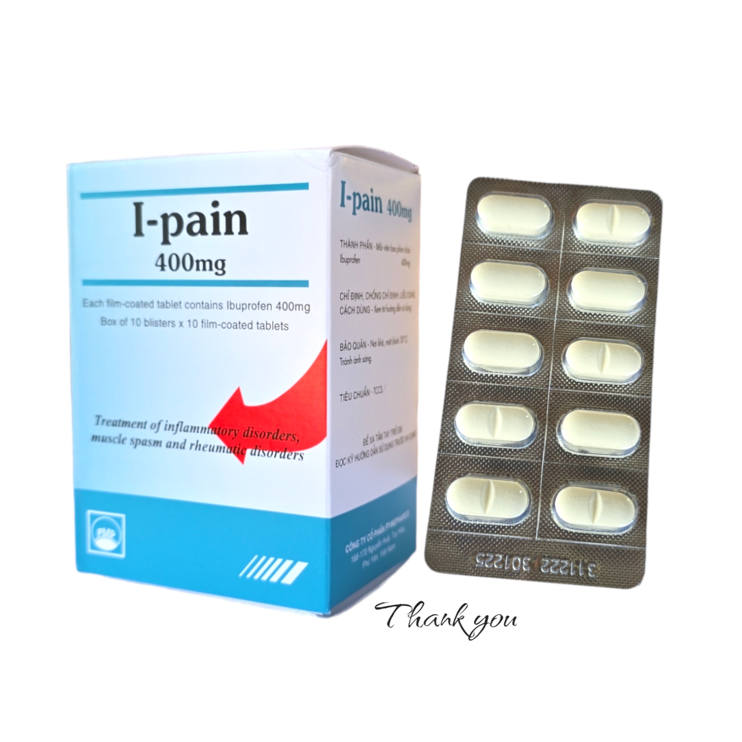 Thuốc I-Pain 400mg là sản phẩm của Công ty cổ phần Pymepharco, có thành phần chính là Ibuprofen. Thuốc được dùng điều trị để làm giảm đau đầu, đau bụng do đến ngày ở nữ giới; đau răng do vận động; đau thắt lưng; đau các rễ thần kinh mức độ nặng; thấp khớp mạn; viêm đa khớp dạng thấp; viêm dính khớp cột sống; vảy nến gây nên thấp khớp; các bệnh về khớp gây đau.