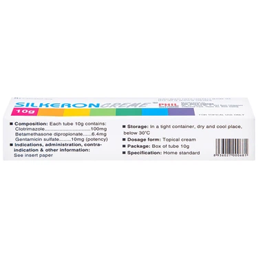 SILKERONCREME của Công ty TNHH PHIL Inter Pharma, thành phần chính là betamethason dipropionat, gentamicin, clotrimazol. SILKERONCREME là thuốc làm giảm triệu chứng viêm của các bệnh ngoài da đáp ứng với corticosteroid khi có biến chứng nhiễm khuẩn và nhiễm nấm thứ phát hay khi nghi ngờ có nhiễm khuẩn và nhiễm nấm.