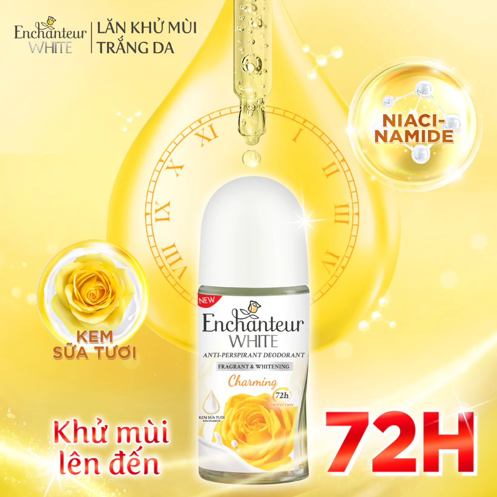 – Lăn khử mùi trắng da Enchanteur giúp ngăn mùi và cho cảm giác khô thoáng suốt 72 giờ. Công thức mới với Hệ phức hợp Pro-White Complex kết hợp từ Kem sữa tươi và Niacinamide giúp dưỡng trắng X2 cùng hương nước hoa Pháp sang trọng, quyến rũ.