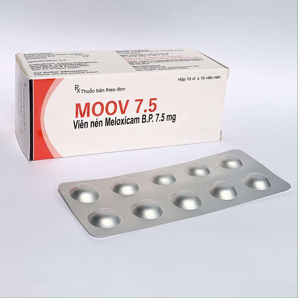 Moov 7.5 là thuốc kháng viêm không steroid (NSAID) mạnh thuộc họ oxicam, giúp kháng viêm, giảm đau, hạ sốt, chống kết tập tiểu cầu. Tuy nhiên, tác dụng hạ sốt kém nên chủ yếu dùng trong giảm đau và chống viêm. Ngoài ra, thuốc còn thấm tốt vào bao hoạt dịch và các tổ chức viêm, thâm nhập kém vào các mô thần kinh nên ít gây ra tác dụng phụ trên hệ thần kinh. Moov 7.5 có sinh khả dụng trung bình là 89%, nồng độ trong huyết tương với liều 7,5mg và 15mg được ghi nhận tương ứng từ 0,4 đến 1mg/l và từ 0,8 đến 2mg/l. Thuốc liên kết mạnh với protein huyết tương, chủ yếu là albumin (99%), được chuyển hóa mạnh, thời gian bán hủy trung bình là 20 giờ, và được bài tiết qua phân, nước tiểu với tỷ lệ 50:50.