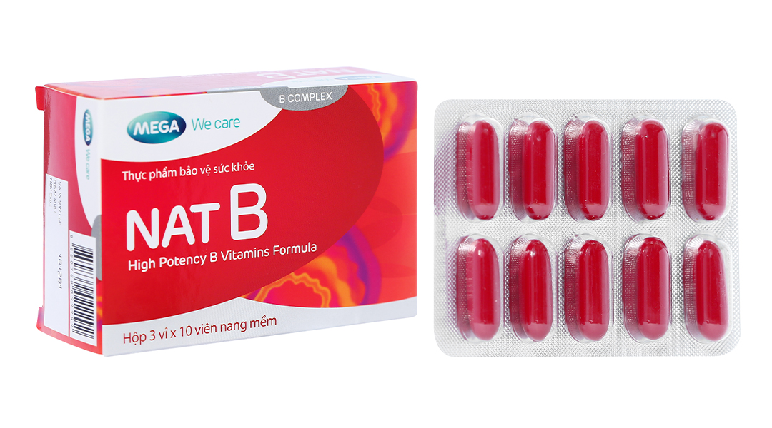 • Nat B là sản phẩm bổ sung vitamin B tổng hợp giúp đáp ứng nhu cầu bổ sung các vitamin B thiết yếu cho cơ thể. Mỗi viên nang mềm Nat B chứa một sự kết hợp của các vitamin B quan trọng như Vitamin B1, Vitamin B2, Vitamin B6, Vitamin B12, Niacinamide (Vitamin B3), Acid Folic (Vitamin B9), Biotin (Vitamin H), Inositol (Vitamin B8) và Choline Bitartrate. Các thành phần này đóng vai trò then chốt trong việc duy trì năng lượng, cải thiện chức năng thần kinh, hỗ trợ sức khỏe tim mạch và cân bằng cảm xúc.