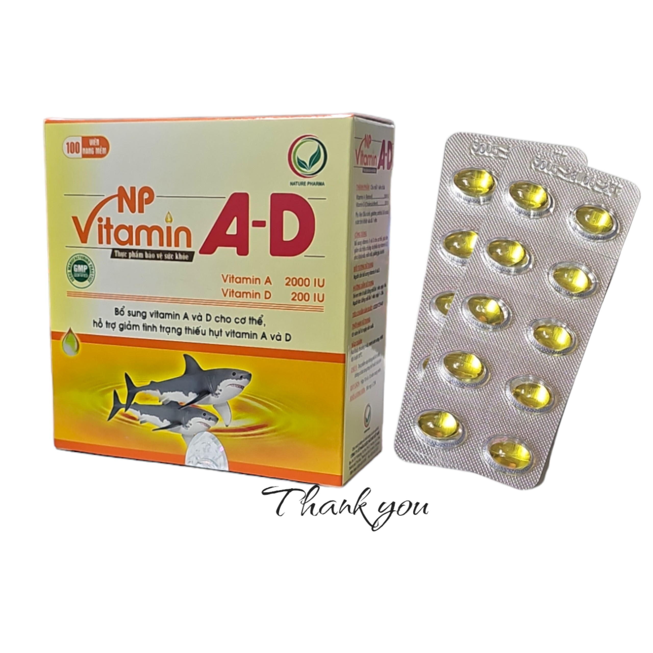 Tên sản phẩm: NP Vitamin A-DQuy Cách đóng gói: Hộp 10 vỉ x 10 viên nang mềmThành phần:Cho mỗi 1 viên chứaVitamin A (Retinol)…..….2000 IU Vitamin D (Cholecalciferol)……………..200 IUPhụ liệu: Dầu nành, gelatine, Sorbitol, Kali sorbat, nước tinh khiết vừa đủ 1 viên. Công dụng:Bổ sung vitamin A và D cho cơ thể, giúp làm giảm các triệu chứng do thiếu hụt vitamin A, D như: khô mắt, mỏi mắt, quáng gà, da khô.Đối tượng sử dụng: Người cần bổ sung vitamin A và D.Liều dùng: Trẻ em trên 6 tuổi: Uống mỗi lần 1 viên, ngày 1 lần. Người lớn: Uống mỗi lần 1 viên, ngày 1-2 lần.Thương hiệu: VIỆT NAMNơi sản xuất: VIỆT NAMTên Nhà sản xuất:CÔNG TY CỔ PHẦN DƯỢC NATURE VIỆT NAMGiấy tiếp nhận đăng ký bản công bố sản phẩm:1/2020/TCSP-AD