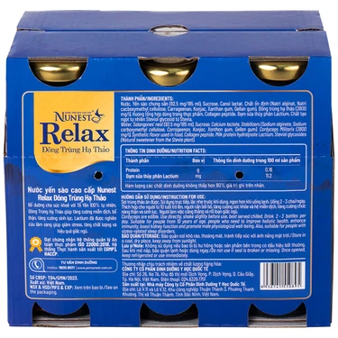 Nước yến sào cao cấp Nunest Relax đông trùng hạ thảo là thực phẩm bổ dưỡng cho sức khoẻ với tổ yến 100% tự nhiên. Sản phẩm còn chứa đông trùng hạ thảo giúp bổ thận, tăng miễn dịch và Lactium làm giảm căng thẳng mệt mỏi.