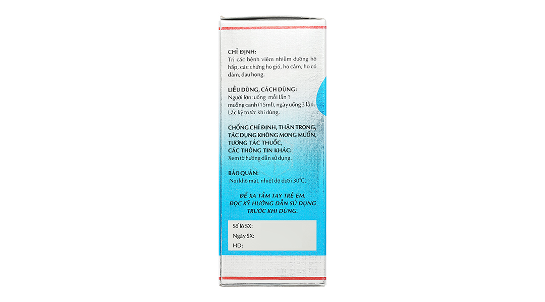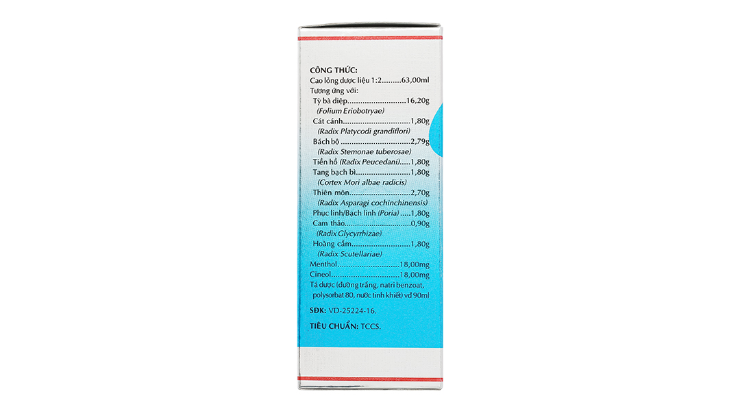 Cho 1 chai 90ml Cao lỏng dược liệu 1:2 63,00ml tương ứng với Tỳ bà diệp (Folium Eriobotryae) 16,20g Cát cánh (Radix Platycodi grandiflori) 1,80g Bách bộ (Radix Stemonae tuberosae) 2,79g Tiền hồ (Radix Peucedani) 1,80g Tang bạch bì (Cortex Mori albae radicis) 1,80g Thiên môn (Radix Asparagi cochinchinensis) 2,70g Phục linh/Bạch linh (Poria) 1,80g Cam thảo (Radix Glycyrrhizae) 0,90g Hoàng cầm (Radix Scutellariae) 1,80g Menthol 18,00mg Cineol 18,00mg Tá dược (đường trắng, natri benzoat, polysorbat 80, nước tinh khiết) vừa đủ 90ml.