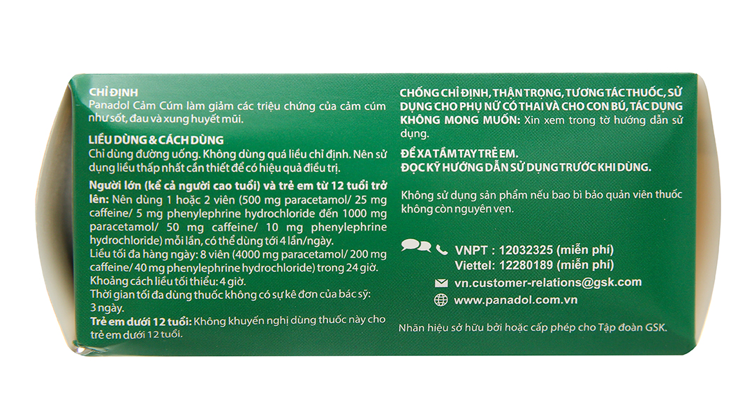 - Hoạt chất: Paracetamol 500mg, Caffeine 25mg, Phenylephrine hydrochloride 5mg.