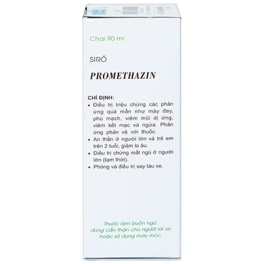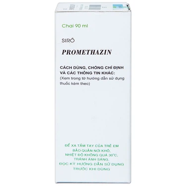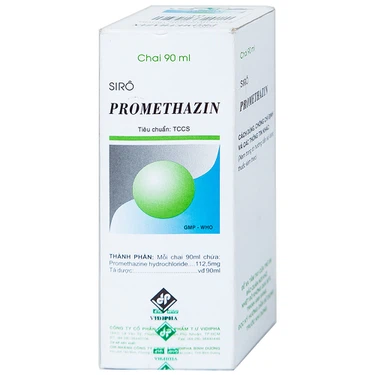 Siro Promethazin 90 ml Vidapha do chi nhánh Công ty Cổ phần Dược phẩm Trung ương Vidipha Bình Dương sản xuất với hoạt chất Promethazine hydrochloride, có tác dụng điều trị triệu chứng các phản ứng quá mẫn như mày đay, phù mạch, viêm mũi dị ứng, viêm kết mạc và ngứa, phản ứng phản vệ với thuốc, an thần ở người lớn và trẻ em trên 2 tuổi, giảm lo âu, điều trị chứng mất ngủ ở người lớn (tạm thời), phòng và điều trị say tàu xe. Sirô, màu vàng nâu, sánh, vị ngọt, có mùi thơm đặc biệt, đựng trong chai nhựa màu nâu 90 ml.