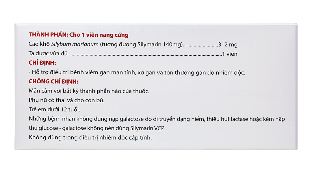 1 viên nang cứng Silymarin VCP gồm: Cao khô Silybum marianum (Extractum Silybi mariani fructus siccum) 312 mg (tương đương Silymarin 140 mg). Tá dược lactose monohydrat, tinh bột sắn, PVP K30, magnesi stearat vừa đủ 1 viên.