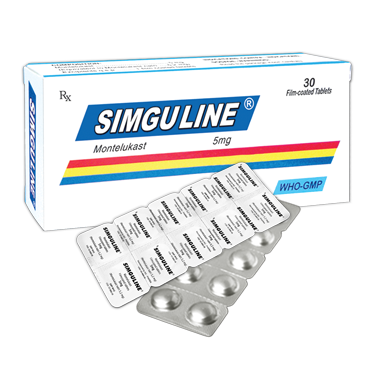 - SIMGULINE được chỉ định cho người lớn tuổi và trẻ em trên 6 năm tuổi để dự phòng và điều trị hen phế quản mãn tính, bao gồm dự phòng cả các triệu chứng hen ban ngày và ban đêm, điều trị bệnh nhân hen nhạy cảm với Aspirin và dự phòng cơn thắt phế quản do gắng sức, làm giảm các triệu chứng ban ngày và ban đêm của viêm mũi dị ứng (viêm mũi dị ứng theo mùa cho người lớn và trẻ em từ 6 năm tuổi trở lên, và viêm mũi dị ứng quanh năm cho người lớn và trẻ em từ 6 năm tuổi trở lên).