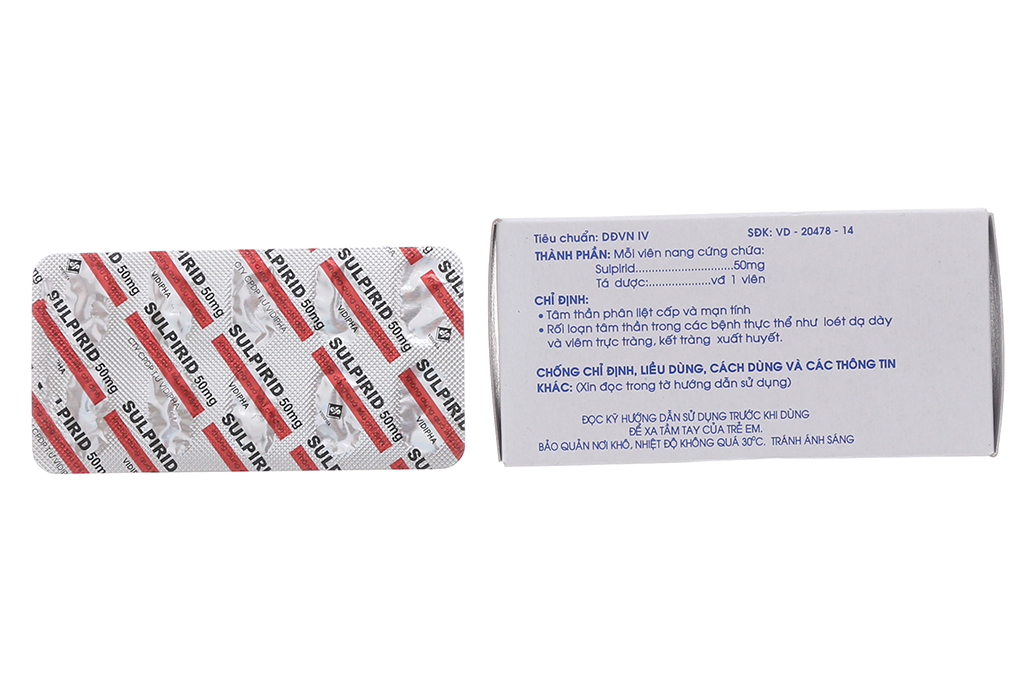 Hoạt chất chính: Sulpirid 50mg. Tá dược: Lactose, bột talc, magnesi stearat, D.S.T.