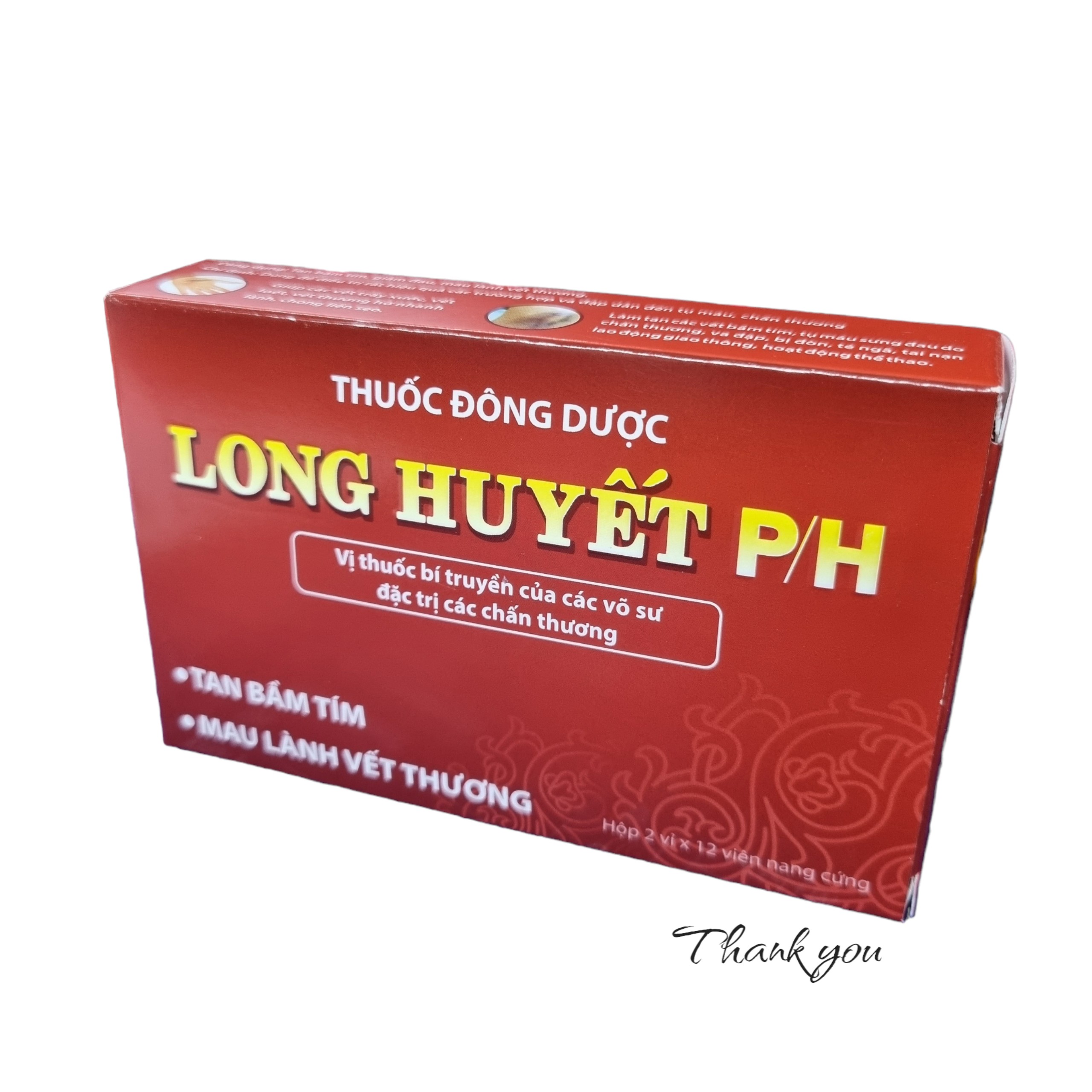 Long huyết P/H được bào chế dưới dạng viên nang cứng với thành phần chính là Cao khô Huyết giác (Lignum Dracaenae cambodianae), bởi Công ty TNHH Đông dược Phúc Hưng sản xuất. Thuốc được chỉ định điều trị trong các trường hợp sưng đau, bầm tím, bong gân, chấn thương do va đập, bị đòn, té ngã, tai nạn lao động, giao thông, luyện tập thể thao, giảm đau và làm tan nhanh các vết bầm tím, giúp nhanh liền vết thương hở ngoài da, vết thương do phẫu thuật, trị mụn nhọt, vết loét.