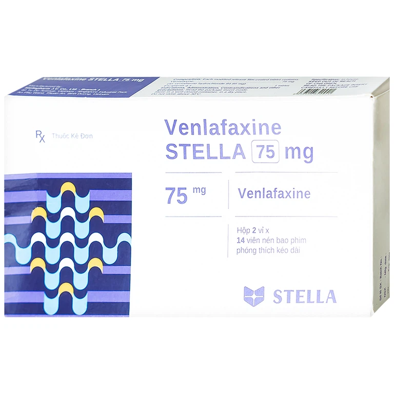 Venlafaxine Stella của Công ty TNHH LD Stellapharm, thành phần chính là venlafaxine 75 mg, là thuốc dùng điều trị các chứng trầm cảm, rối loạn lo âu, hoảng sợ. Venlafaxine được bào chế dưới dạng viên nén bao phim phóng thích kéo dài, màu trắng, hình thuôn dài, 2 mặt khum, trơn. Sản phẩm có quy cách đóng gói gồm hộp 2 vỉ x 14 viên.