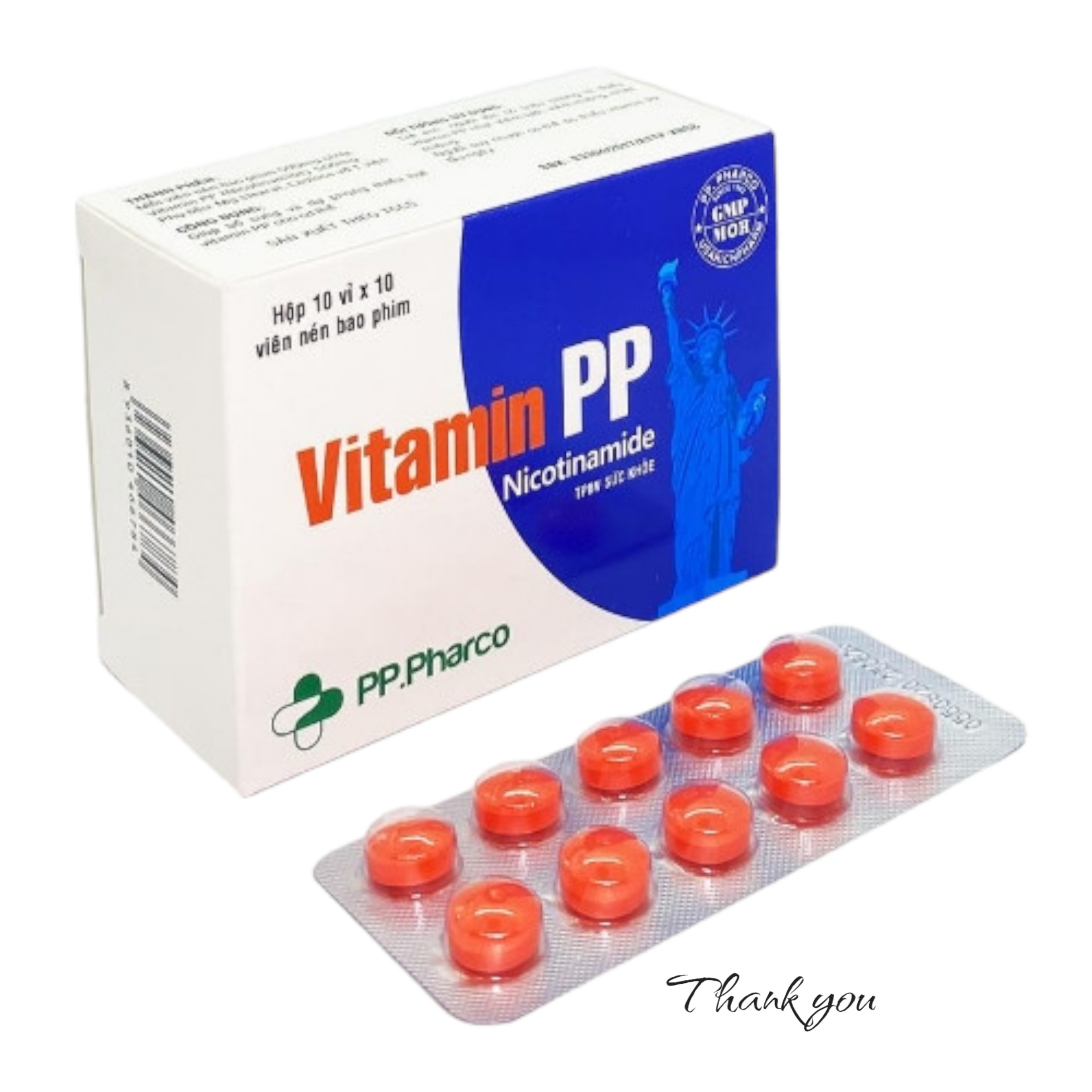 Thành phần Vitamin PP (Nicotinamide) 5.00mg Phụ liệu: Mg stearat, Lactose vừa đủ 1 viên